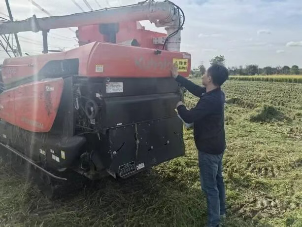 在作业现场,技术人员对正在作业的收割机进行全面“把脉”。首先对农机服务组织负责人强调了农机手持证上岗、收割机械年检情况及保险购买的重要性,随后通过发放安全手册、张贴警示标语等方式,向农机手强调杜绝疲劳驾驶、违规操作等行为,要求时刻绷紧安全生产弦,严格遵守操作规程,确保秋收期间农机作业零事故。