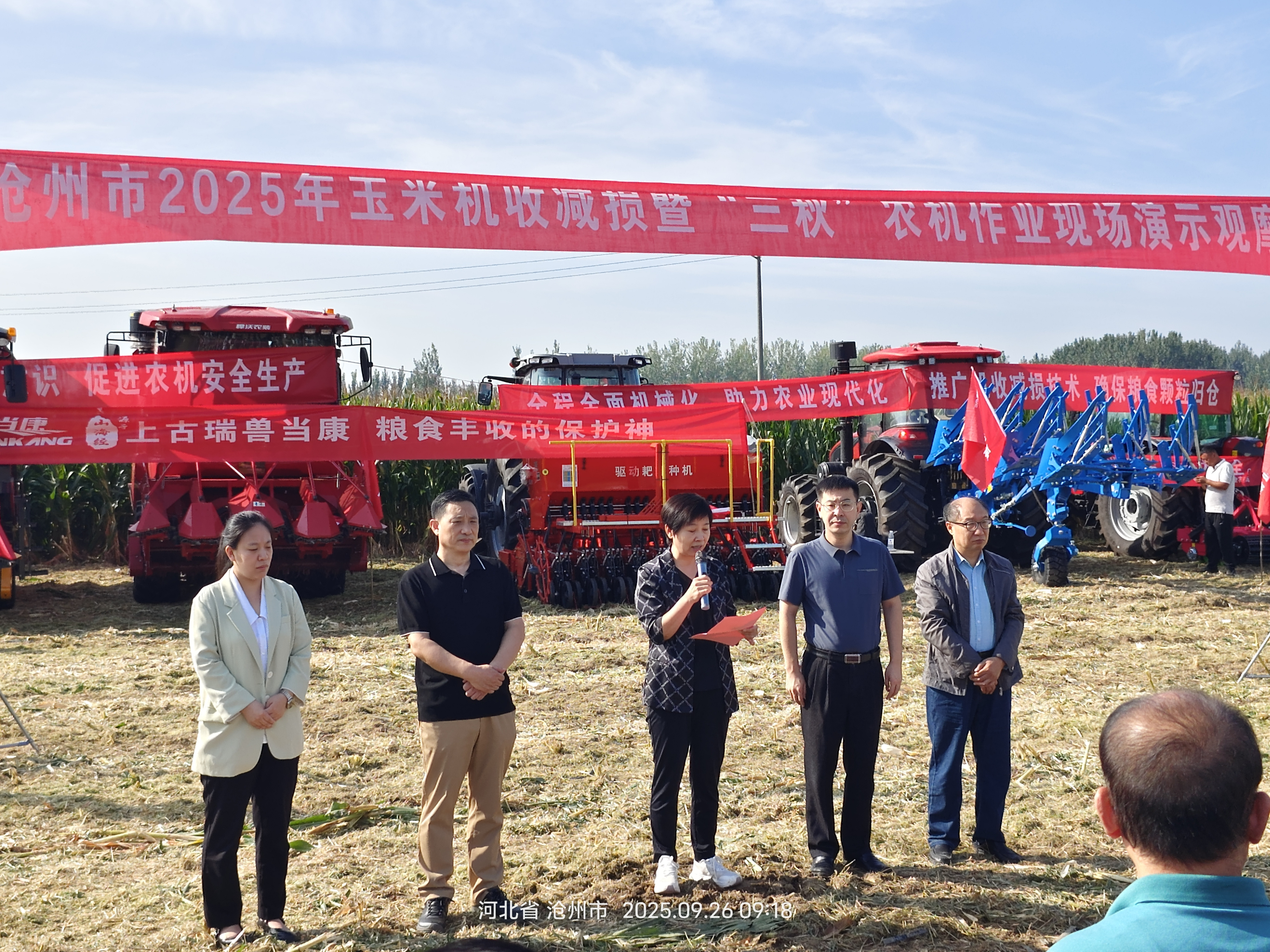 为了全面贯彻落实习近平总书记“坚决扛牢保障国家粮食安全重任,确保粮食稳产丰产”的重要指示,确保秋粮丰收、颗粒归仓,9月26日,河北省沧州市农业农村局在河北省沧州市河间市国欣农村技术服务总会举办了河北省沧州市2025年玉米机收减损暨“三秋”农机作业现场演示观摩会。河北省沧州市农业农村局副局长韩荣彩、河北省沧州市河间市人民政府副市长张子良、河北省沧州市农业农村局四级调研员李卫东、河北省沧州市河间市农业农村局局长董相臣、河北省沧州市各县(市、区)农业农村局主管农机推广工作的副局长、农机科(股、站)长、农机推广站站长及技术人员、农机合作社和农机大户代表,共120余人参加了现场会。