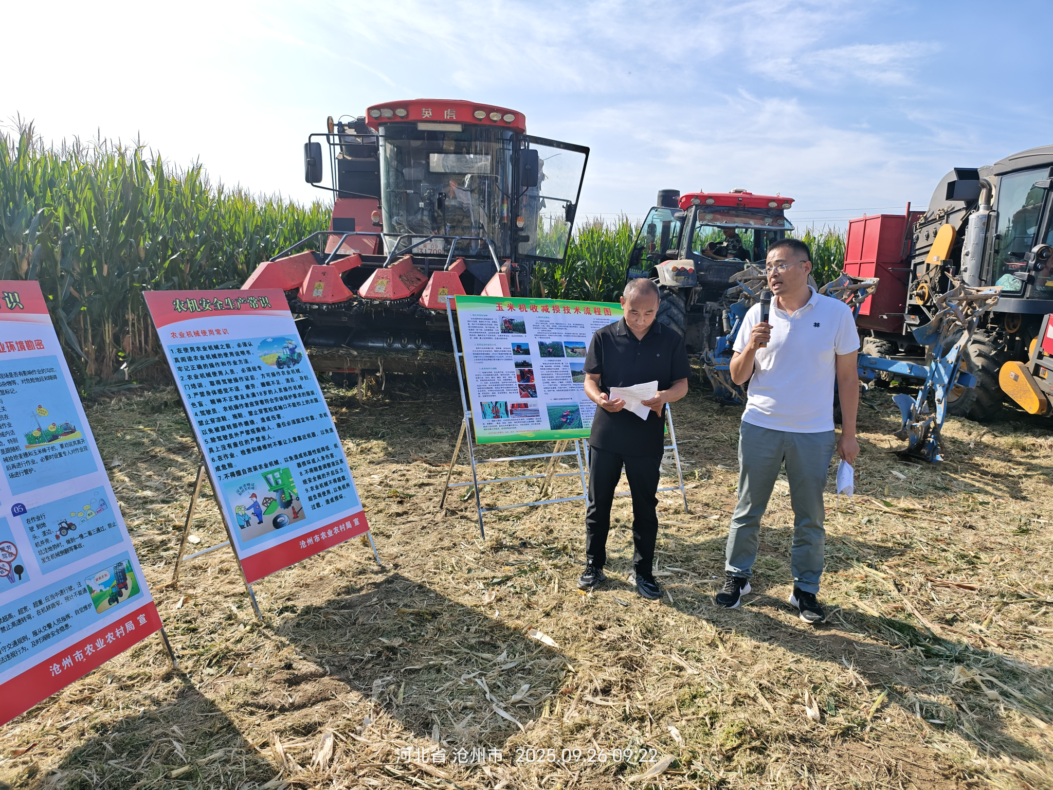 河北省沧州市河间市农业农村局农机站站长刘铁伟就“三秋”农机作业安全注意事项和玉米机收减损进行了专题讲解。现场会分为静态展示和动态作业演示两部分。静态展示包括玉米收获类、耕整地、小麦耙播一体机、智能农机类、气吸式玉米播种机、植保飞防类、动力机械、智能喷灌机等设备,沧州田霸农机有限公司、山东当康农业装备有限公司、河北沃田机械制造有限公司、河北省峥嵘农机有限公司、沧州富邦农牧机械有限公司的技术人员分别进行了讲解。