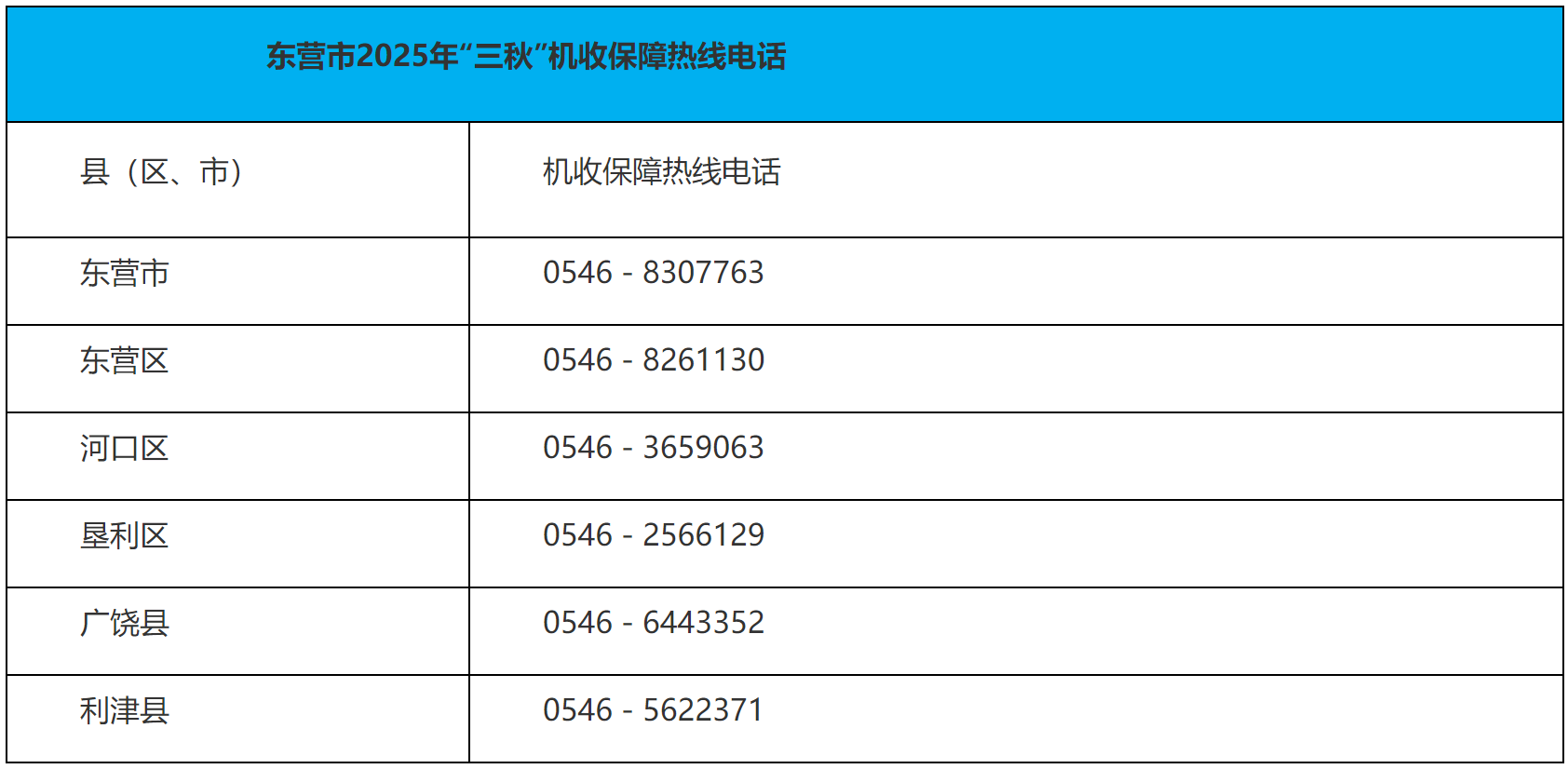 为更好地服务“三秋”农业生产和农机手,及时协调解决全市“三秋”期间机收机播等有关问题,山东省东营市、县两级农业农村部门设立了“三秋”机收保障热线电话,现予以公布。