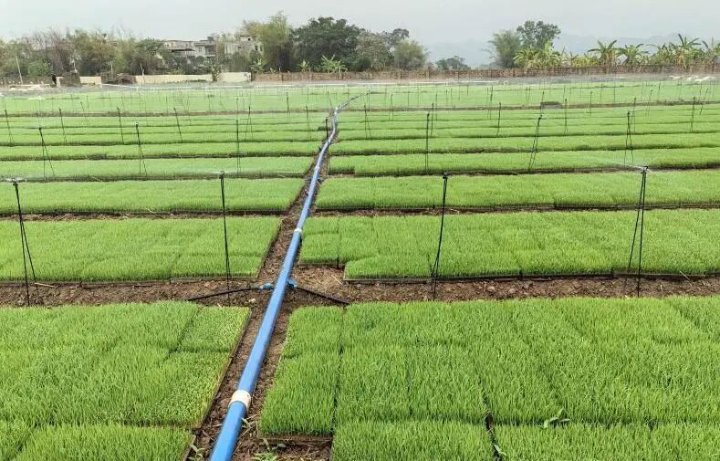 炼秧场上自动喷淋设备正在浇灌秧苗