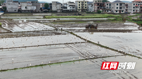 在江永县千家峒瑶族乡的连片农田里,一台台翻耕机轰鸣作业,来回穿梭深耕整地,翻松的土壤松软整齐,为下一步水稻插秧、作物播种打下良好基础。伴随着农机轰鸣,成群牛背鹭紧随翻耕机起落飞舞,在新翻的泥土中悠闲觅食。灵动的鸟儿与现代化农机相映成趣,成为瑶乡春耕时节一道亮丽独特的生态景观,生动展现出当地生态环境持续改善的喜人成效。