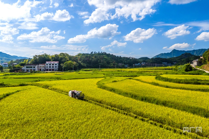 湖南娄底双峰县,收割机在田间作业(央广网发 双峰县委宣传部 供图)