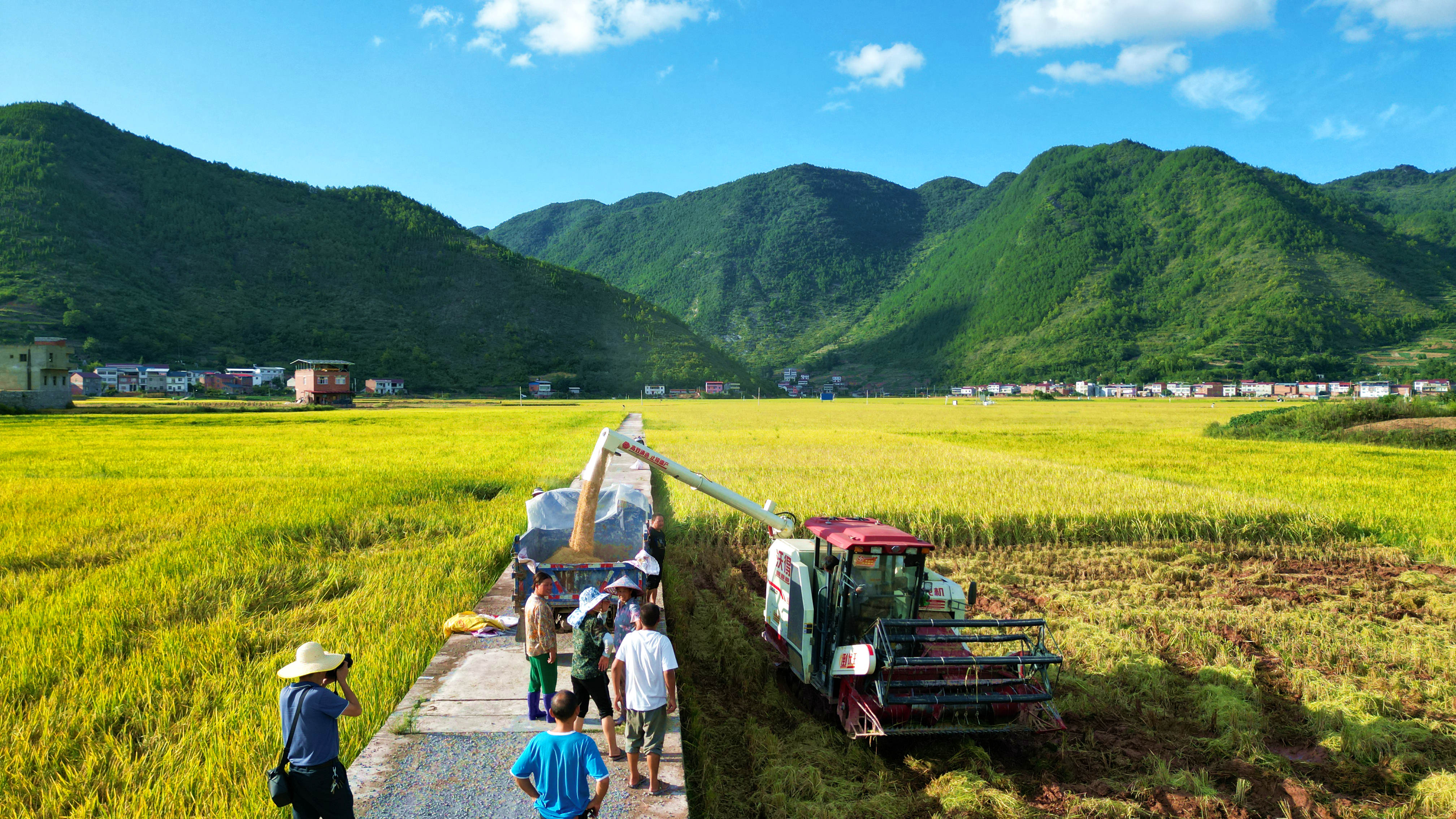 ▲巫山县庙宇镇永安村,农机手驾驶收割机正在收割水稻。特约摄影 王忠虎/视觉重庆
