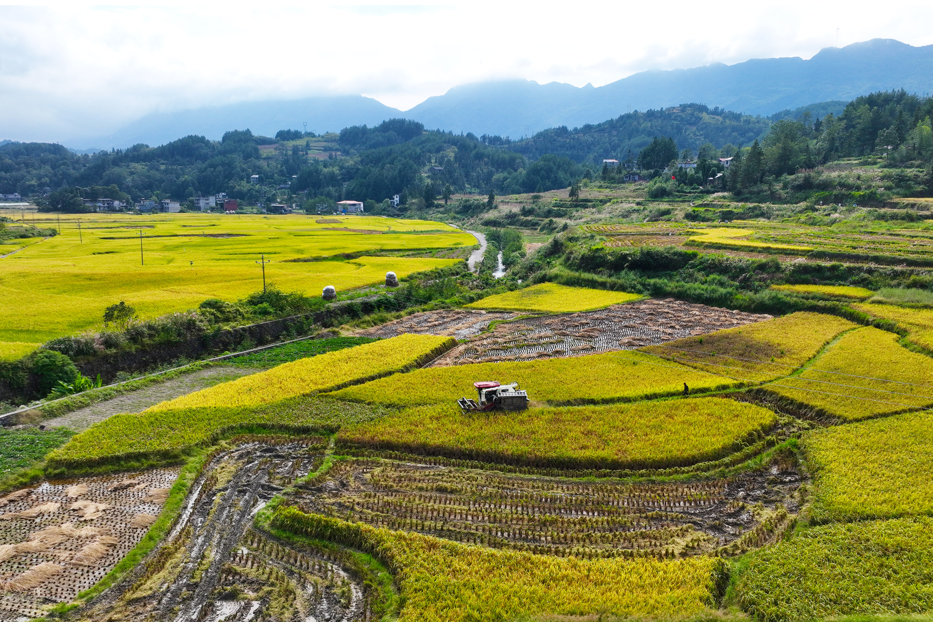 ▲黔江区马喇镇杉树村,农机手操作收割机在“马喇贡米”基地收割稻谷(无人机照片)。特约摄影 杨敏/视觉重庆