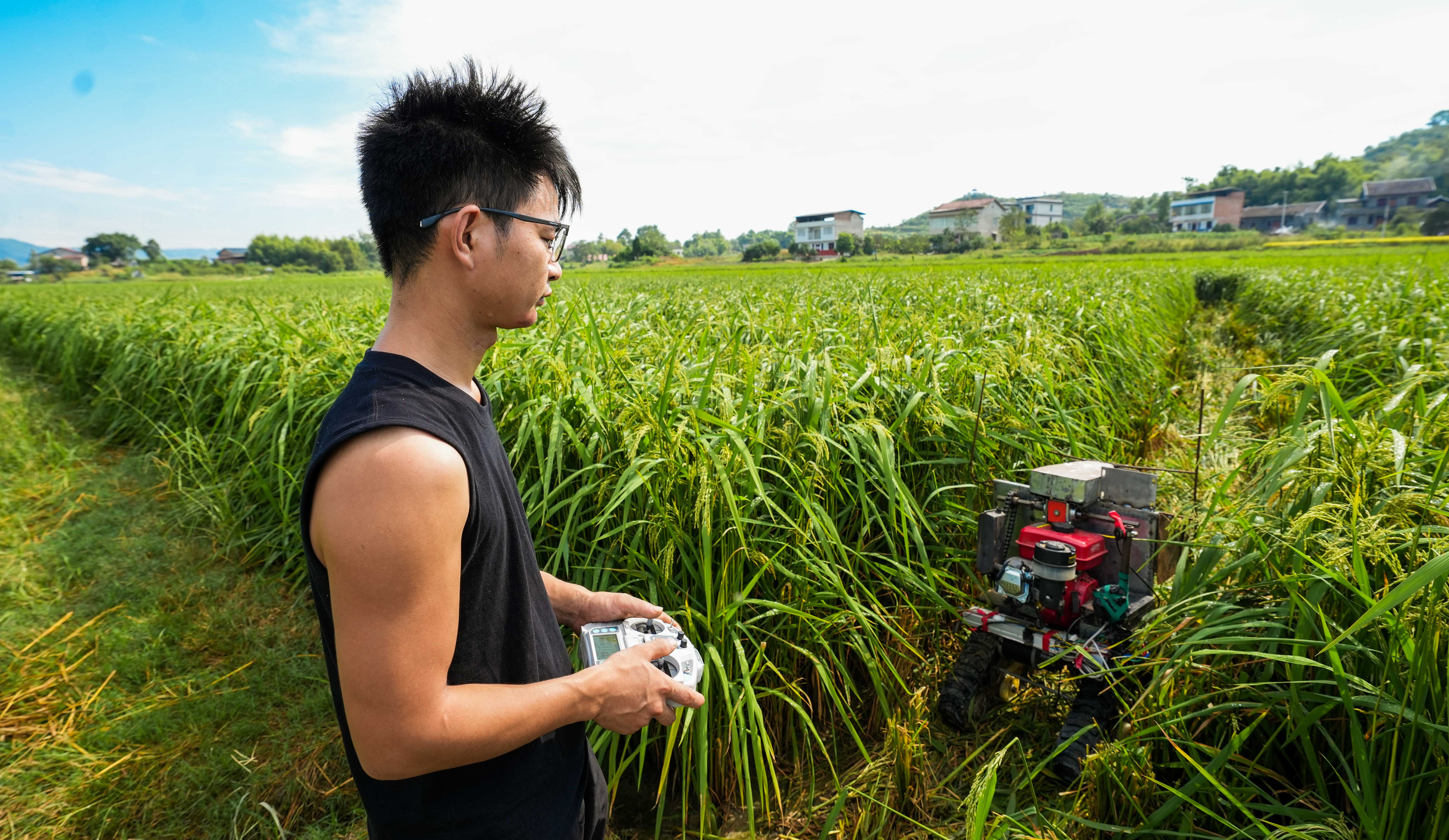 ▲垫江县沙坪镇李白村制种水稻基地,春耘(重庆)科技有限公司的技术员在测试新研发的种子采集智能农机。特约摄影 龚长浩/视觉重庆